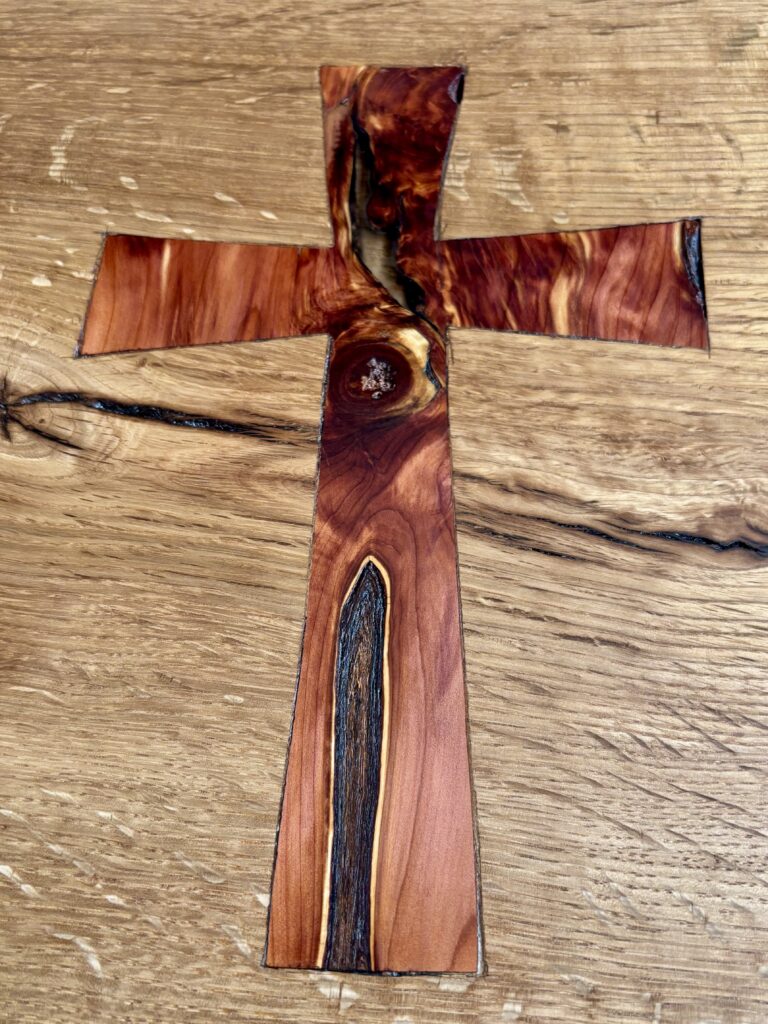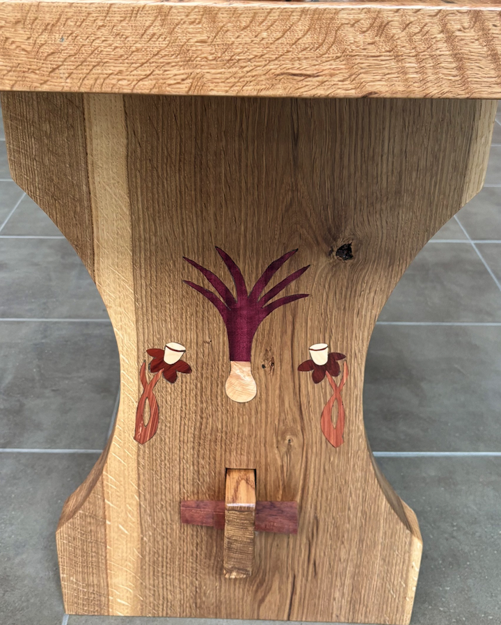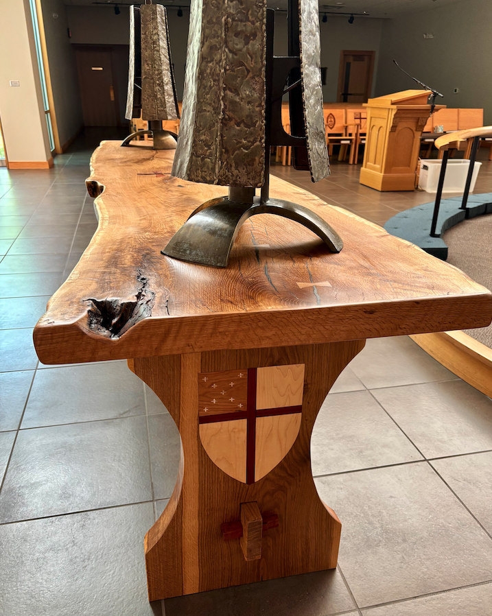 The table, which is 8 feet long,was crafted from live edge quartersawn white oak. The wood is both hard and stable, ensuring its endurance for generations. The center of the table features an inlaid cross made from aromatic cedar. One end of the trestle base is adorned with an inlay of the Episopal shield, crafted from maple, cherry, ad padauk. The opposite end bears an inlay depicting a leek and daffodils, made from cedar, redheart maple, and purpleheart woods. These symbols honor the church’s patron, St. David of Wales. Along each side of the treslte, the words “Do this for the remebrance of me” are engraved.