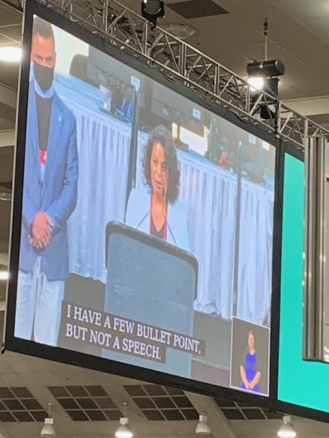 The back of the convention hall is set with tables containing campaign materials and deputies are sporting bracelets, fans, and buttons for their preferred candidate. Ahead of GC, Zoom candidate forums allowed deputies to get a feel for the candidates.