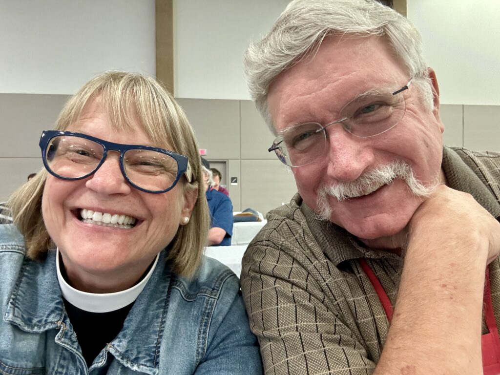 Mother Doreen Rice from St. David’s, Topeka (left) and Larry Hannan from St. Luke’s, Wamego send greetings from General Convention.