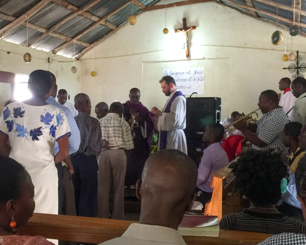 The Rev. Dr. David Cox of St. Michael and All Angels, Mission, serves communion with the Rev. Louie Rosanas at St. Paul’s parish in Haiti.